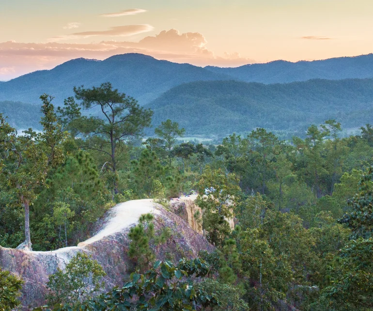 Pai Canyon offers dramatic landscapes carved by time and wind. Walk along narrow ridges and cliffs overlooking pine forests and rice valleys.